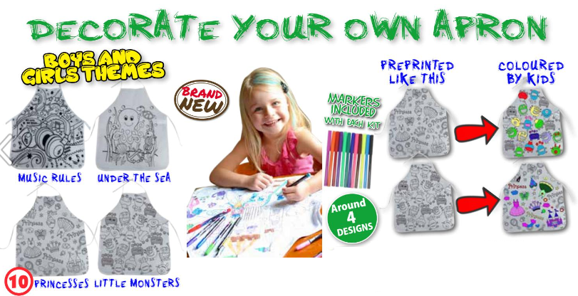 Children get to pick from the cool random designs provided and colour in their apron with the felt pens supplied with each kit.