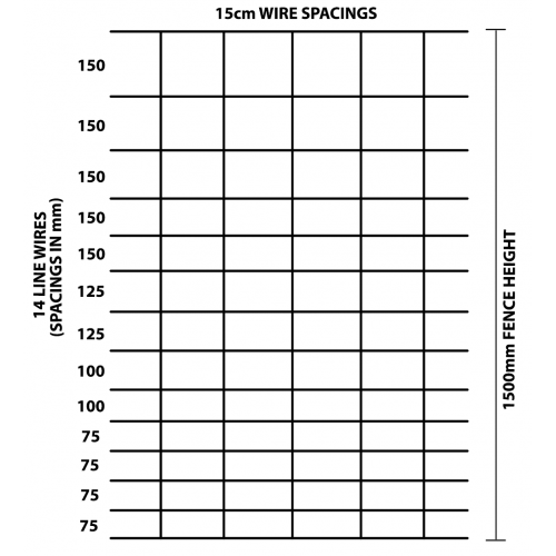 - 1500H fence has Horizontal holes from the bottom has a wires to make holes spacing of are 75mm then 75mm then 75mm then 75mm then 100mm then 100mm then 125mm then 125mm then 150mm then 150mm then 150mm then 150mm then 150mm