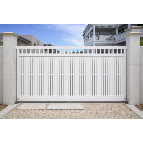 Our heavy-duty aluminium sliding gates are built using 65mm vertical slats on the lower section and 38mm vertical battens on the top, creating a clean Hamptons-style look with excellent airflow.