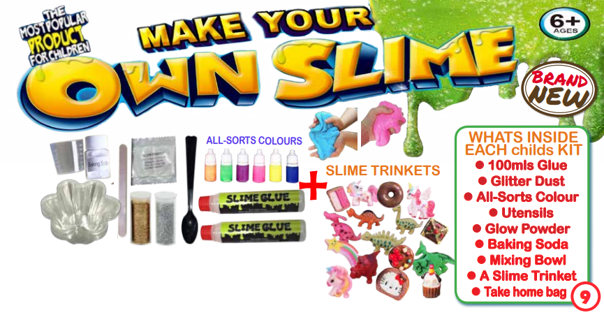 Each kit comes with exciting extras to add to the activity. such as Glitter, a take home bag and a small toy called a "Slime trinket" to bury into the slime.