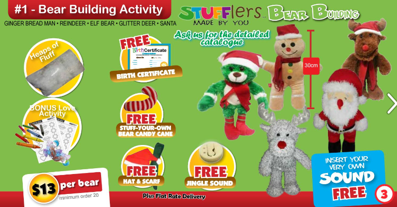 Enjoy a hand stuff activity at your centre with our 30cm Xmas Collection! Each bear comes with a FREE Stuff-a-Candy Cane, FREE Hat and Scarf, FREE Jingle sound, Birth Certificate, Love insert and all the stuffing you need!