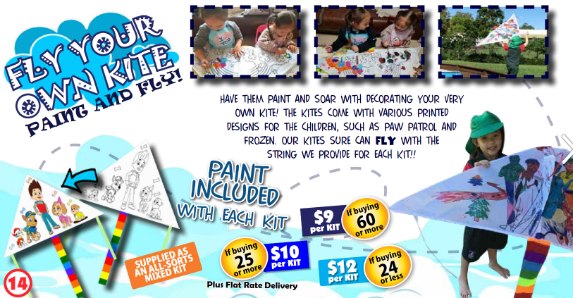 The kites come with various printed designs. Favourites like Frozen, Paw Patrol and generic designs like a Chinese dragon!