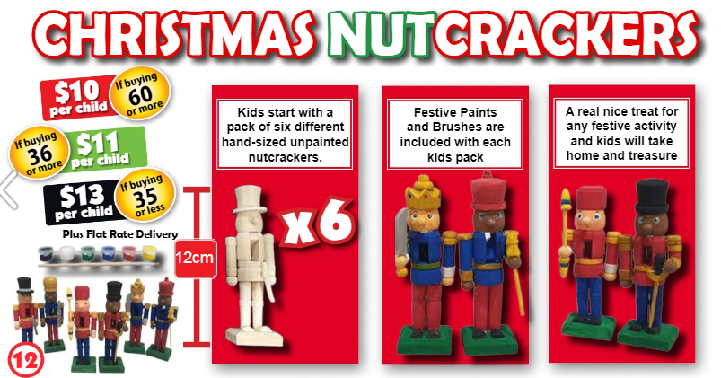 Each child gets a set of 6 x 12cm wooden nutcrackers to paint and design. Each set of 6 comes with its own set of paints and paintbrush.
